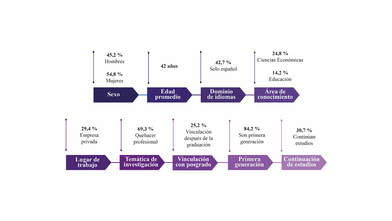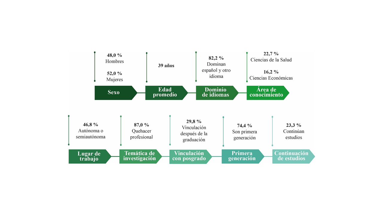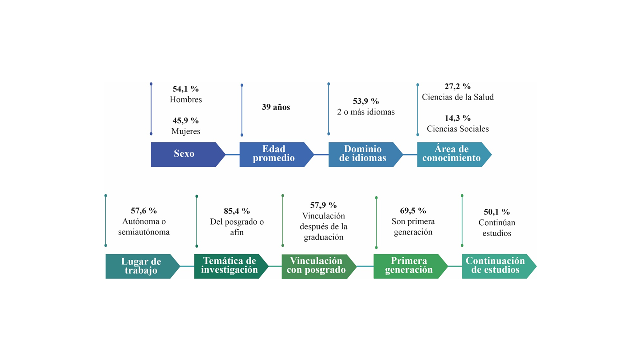 Al momento de la consulta, más de la mitad de las personas graduadas de posgrados en universidades estatales indicaron que se dedican a la investigación posterior a su graduación, y obtienen principalmente el grado de maestría, son hombres y mujeres en edad promedio de 40 años.