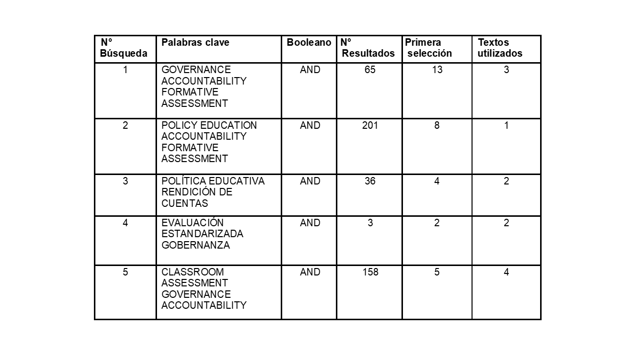 Por su parte, la metodología empleada se basó en la revisión sistemática, la cual inicia con la formulación de los objetivos y formulación del problema, identificación de las fuentes, revisión de bibliografía donde se aplican criterios de selección para la obtención de resultados y conclusiones (Salcido et al., 2021). Del mismo modo, el estudio se fundamenta en el método deductivo, el cual facilita el análisis de las principales tensiones que surgen entre los actores e instituciones en las prácticas y desarrollo de políticas educativas referidas a evaluación desde principios heurísticos (Palmett, 2020). En particular, se aborda la tensión referida al uso de la evaluación: para la rendición de cuentas o para el aprendizaje, a partir del análisis crítico de la gobernanza y su influencia en la formulación de políticas públicas en evaluación educativa.