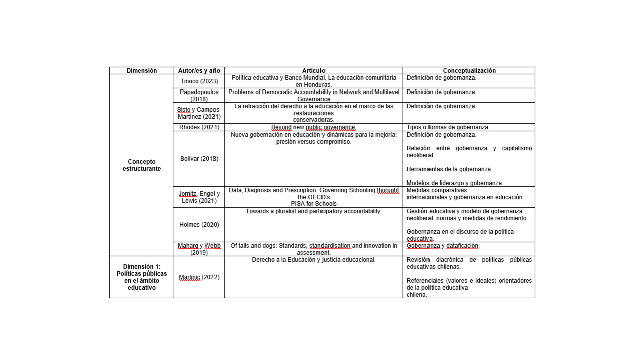 Para comprender cómo las políticas públicas impactan en la evaluación educativa en virtud de la gobernanza neoliberal, es menester profundizar en este concepto a partir de la revisión sistemática realizada, la cual, a su vez, arroja distintas dimensiones de análisis, especificadas a continuación.