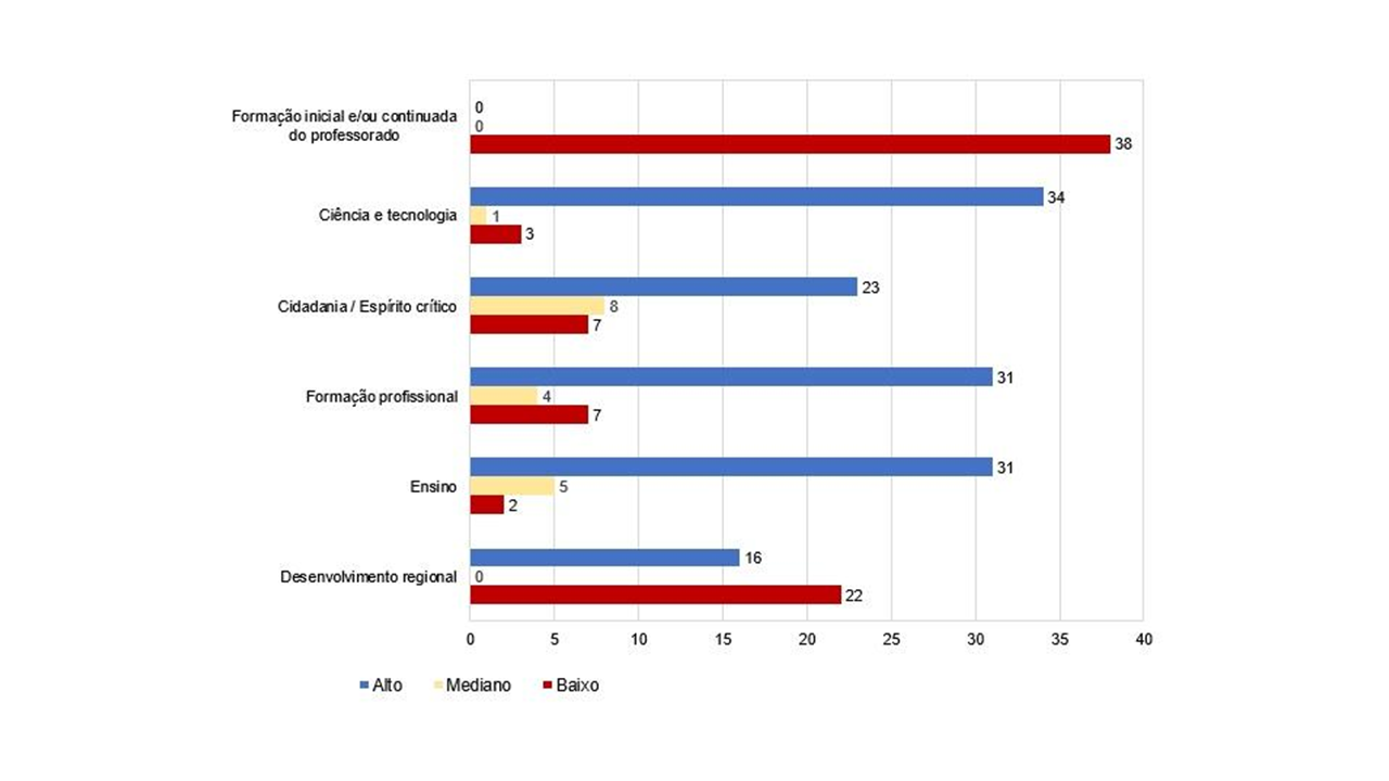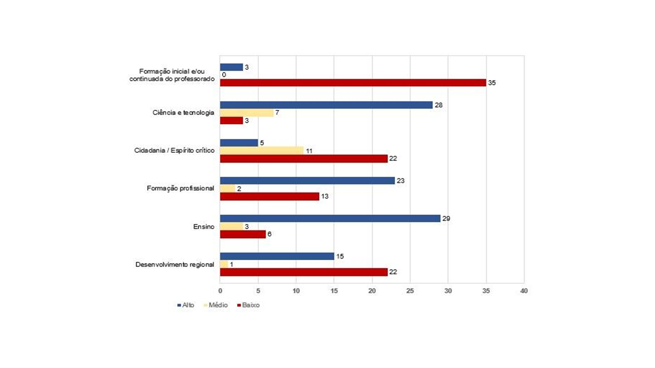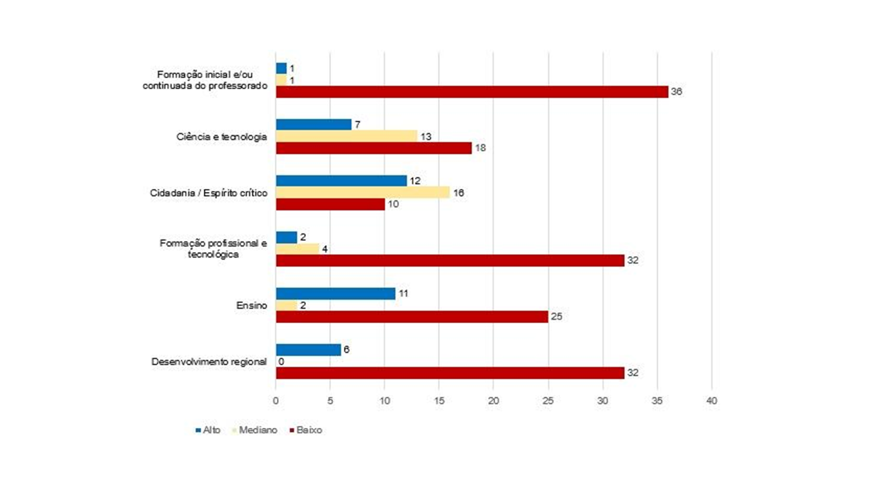 O levantamento efetuado junto aos Planos de Desenvolvimento Institucional abarcou os 38 Institutos Federais, sendo que cada um deles apresenta apenas uma missão. Da análise do conteúdo dessas missões, constatou-se que a formação para o magistério não é compreendida como um propósito central de suas existências, já que nenhum deles apresenta grau de alinhamento alto ou, sequer, mediano de suas missões a tal quesito. Em contrapartida, os Institutos Federais se reconhecem como protagonistas da produção de ciência e tecnologia e da oferta de ensino e formação profissional, bem como, com menor incidência, da cidadania e do espírito crítico e do desenvolvimento regional. A Figura 1 ilustra tais resultados.