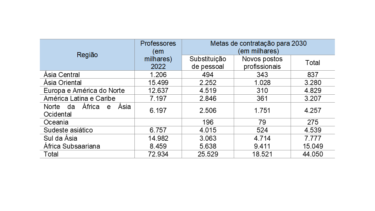Em 2016, a Unesco estimava o déficit global de docentes em 69 milhões (Unesco, 2016). Em 2023, projetava que, mesmo com uma redução de um terço, esse déficit atingirá quase 44 milhões em 2030, como indicado na Tabela 1. Em outras palavras, haverá escassez de docentes tanto para atender à criação de novas vagas na educação básica – como no caso da África Subsaariana, com um déficit de 15 milhões – quanto para preencher vagas já existentes. Esse último caso é exemplificado pela Europa e pela América do Norte, que, apesar das baixas taxas de natalidade, demandarão mais de 4 milhões de professores para substituir aqueles que se aposentam ou deixam a profissão (Unesco, 2023b).