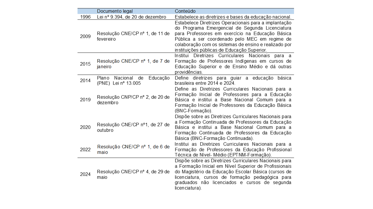 No Brasil, uma série de documentos forma a base normativa e conceitual dos cursos de licenciatura, abarcando diretrizes, resoluções, pareceres e leis que estabelecem seus princípios, fundamentos e procedimentos, regulamentam a formação de professores e a organização dos cursos de licenciatura. A Tabela 2 sintetiza parte do enquadramento legal e pedagógico das licenciaturas no Brasil.