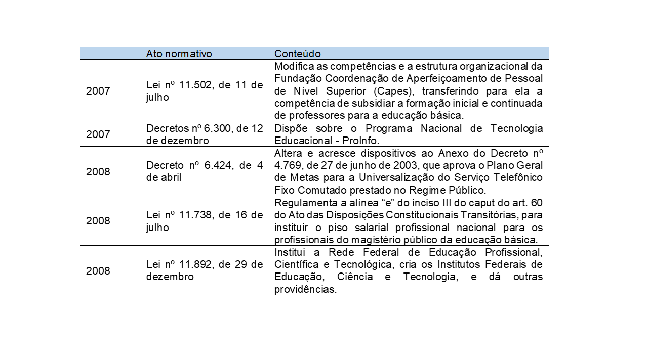 As políticas públicas federais oriundas do movimento político-administrativo de 2007 e 2008 estiveram centradas na ampliação do acesso às tecnologias da informação e comunicações, por meio do Decreto nº 6.300, de 12 de dezembro de 2007 e Decreto nº 6.424, de 4 de abril de 2008, que tinham como principais objetivos, respectivamente, promover o uso pedagógico das tecnologias de informação e comunicação nas redes públicas de educação básica e a obrigação das operadoras de telefonia promoverem a instalação de infraestrutura de rede para suporte a conexão à internet em todos os municípios brasileiros, conectando todas as escolas públicas urbanas (Amaral e Assunçao, 2017).