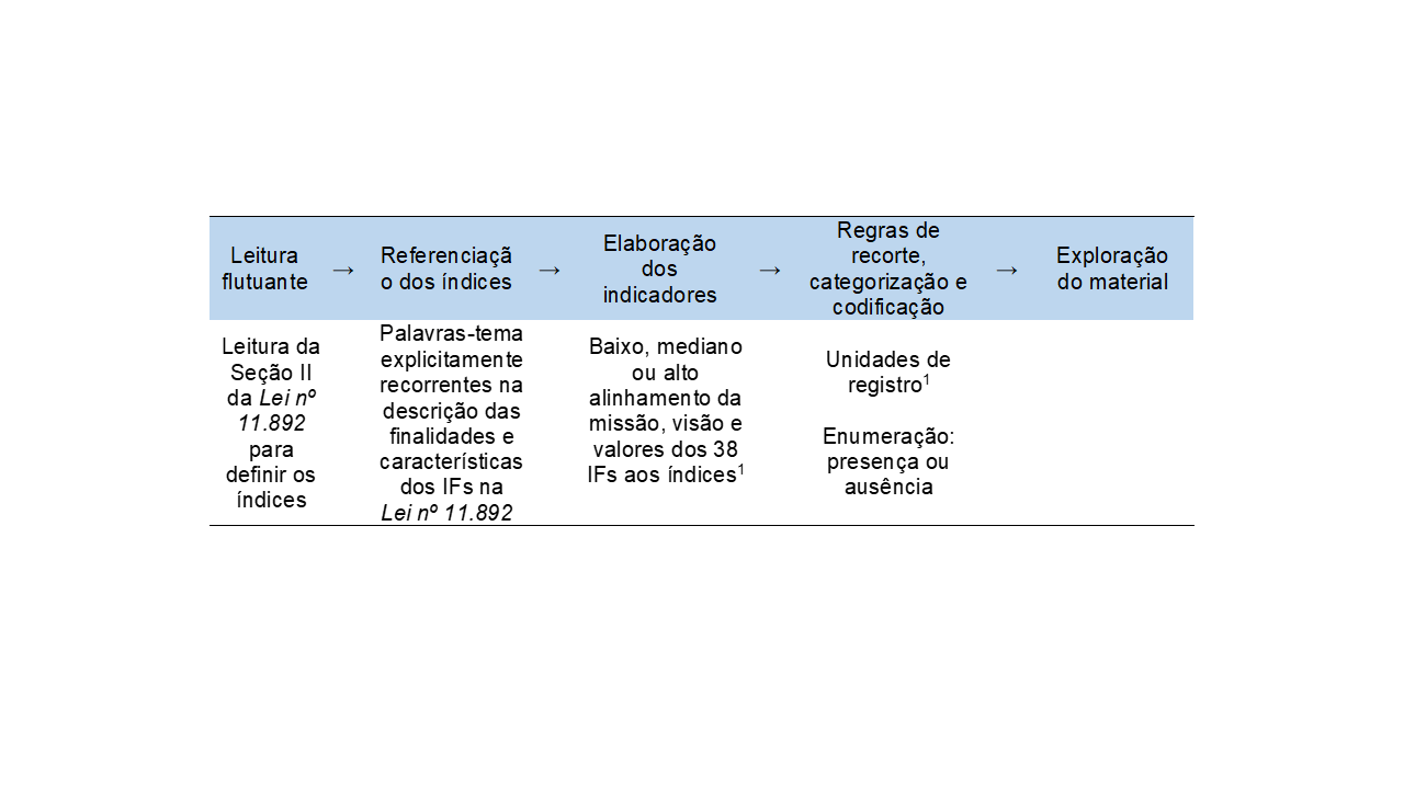 Este estudo de enfoque misto e caráter correlacional recorreu a técnicas da análise de conteúdo para definir as unidades de análise e orientar a coleta e a codificação dos dados. Transitou, desse modo, entre dados, técnicas de coleta e análise tanto qualitativos quanto quantitativos: em um plano, a partir de uma pesquisa documental em fontes institucionais, preocupou-se com a identificação do conteúdo presente no mecanismo de planejamento estratégico utilizado por cada um dos 38 Institutos Federais para comunicar ao público seu propósito central, seus objetivos futuros e seus princípios, sistematizados na forma da missão, da visão e dos valores; em outro plano, explorou a frequência com que a formação do professorado, em comparação com as demais finalidades e características dos Institutos Federais, é mencionada.