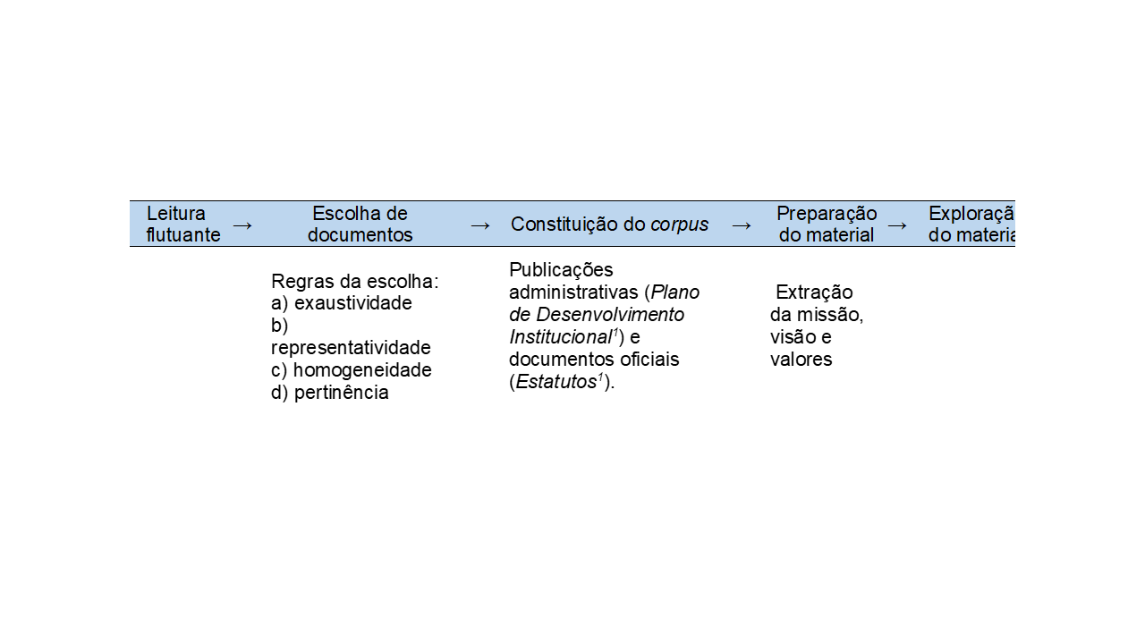 Depois da referenciação dos índices e elaboração dos indicadores, a segunda frente da pré-análise envolveu os documentos institucionais. A leitura flutuante permitiu o contato inicial com os documentos. A seguir, passou-se para a escolha dos documentos a serem estudados, considerando que estejam dentro do universo investigado e que atendam às regras da exaustividade, da representatividade, da homogeneidade e da pertinência. Demarcado o gênero de documentos, procede-se ao estabelecimento do corpus, a saber, do conjunto de documentos especificados que foram submetidos aos procedimentos de análise.
