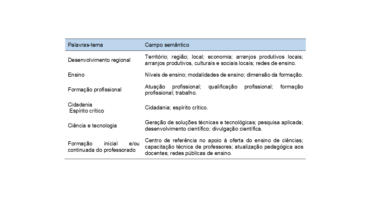 Esta primeira frente da pré-análise de conteúdo delimitou seis palavras-tema impressas no documento legal que estabelece as características e finalidades dos Institutos Federais, às quais foram agrupadas outras correlatas que fazem parte do mesmo campo semântico. A formação de professores foi uma delas, ao lado do desenvolvimento regional, do ensino, da formação profissional, da cidadania e do espírito crítico, e, por fim, da ciência e da tecnologia.