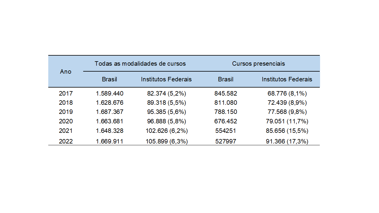 Por um lado, esta pesquisa identificou que a lógica de desprestígio das licenciaturas adentrou os próprios Institutos Federais, na medida em que seus documentos de orientação estratégica/institucional suprimem, em geral, a formação de professores de sua missão, visão e valores. Por outro lado, tais dados contrastam com o próprio protagonismo que os Institutos Federais vêm assumindo na formação de professores. A partir de dados do Censo Escolar e da Plataforma Nilo Peçanha (Tabela 7), constata-se uma crescente no número de matrículas nos cursos de licenciatura, chegando a 91.366 no ano de 2022, ou seja, 14 anos depois de sua criação, os Institutos Federais já respondiam por 17,3% do número de matrículas nas licenciaturas presenciais do país, apesar do sistemático corte de verbas imposto à educação pública federal a partir de 2016, com o governo de Michel Temer, e, a partir de 2018, com o governo de Jair Bolsonaro, período que os Institutos Federais contaram com a menor dotação orçamentária desde 2010 (Neuhold e Pozzer, 2023).