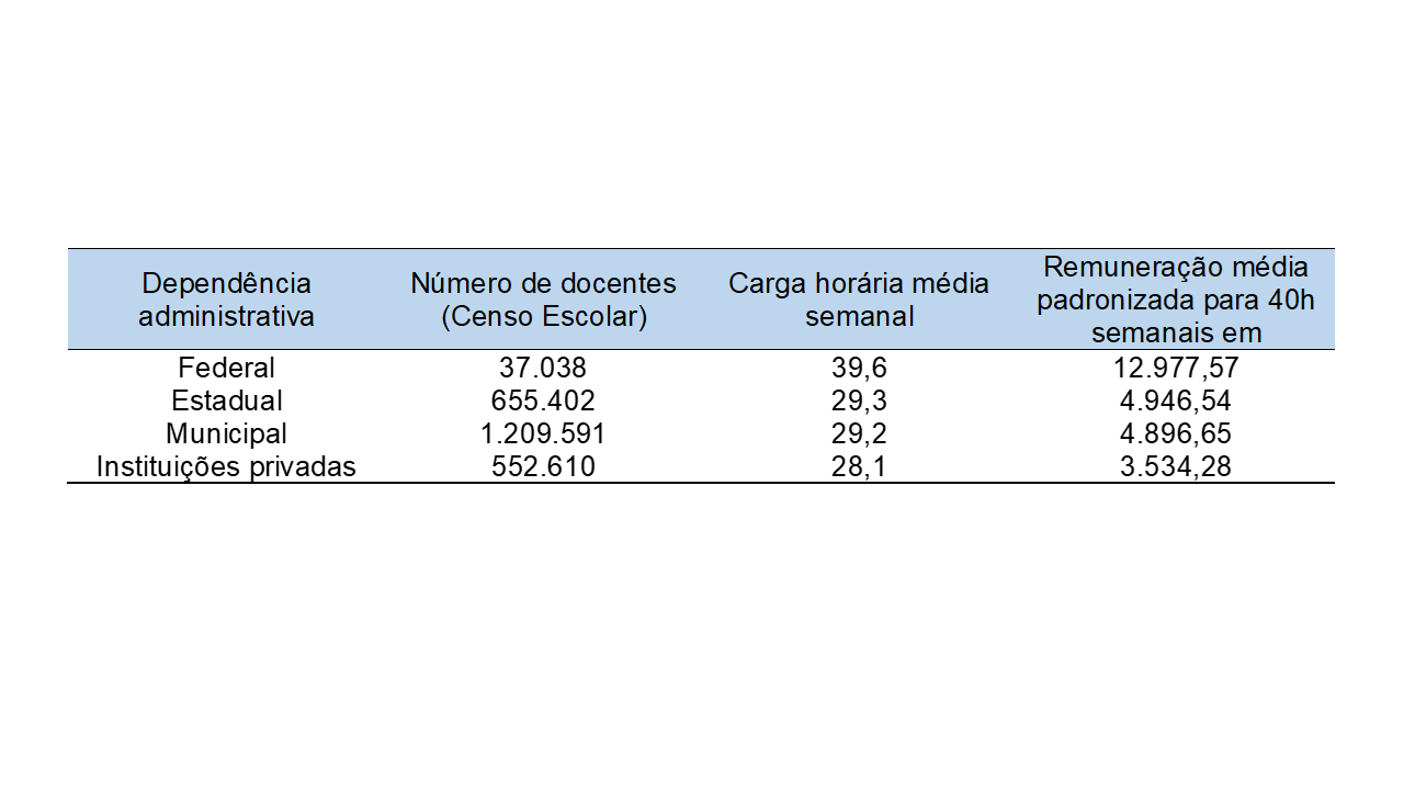 Os dados acerca das remunerações dos docentes evidenciam a assimetria significativa entre as instituições públicas e privadas. Cerca de 22,5% do professorado brasileiros trabalham em instituições privadas e recebem salários 28% menores do que os professores das redes públicas municipais. No entanto, a maior disparidade está na remuneração do professorado federal, que, em média, recebe três vezes mais do que a média dos demais professores.