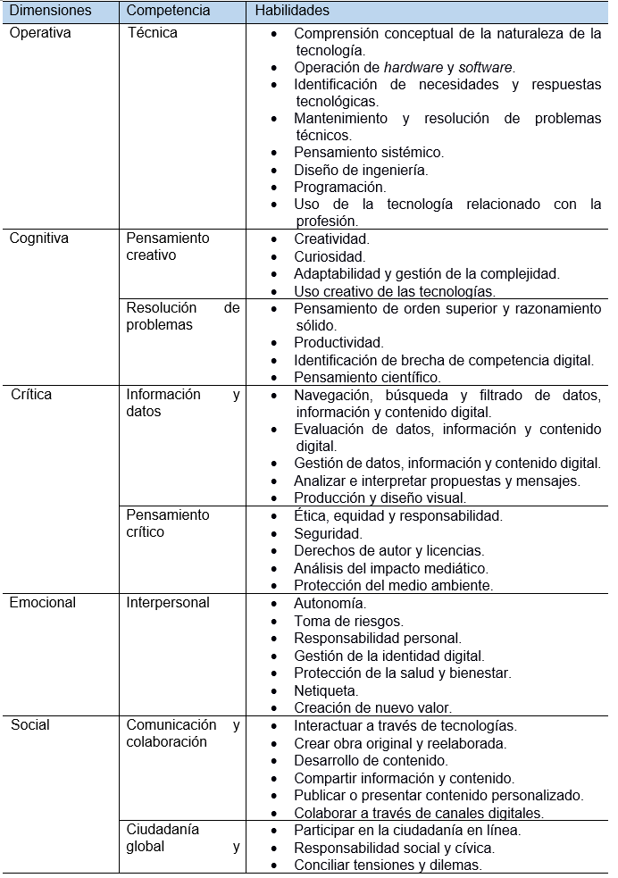 Según Zavala et al. (2016), las competencias digitales se refieren a un conjunto de habilidades, conocimientos y actitudes relacionadas con la gestión de la información, el manejo de recursos tecnológicos, multimediales y comunicativos. Esto implica una relación compleja en el mundo del trabajo, no solo en lo que se debe conocer o qué debe hacerse, sino también en cómo debe realizarse el uso de esa tecnología para responder eficientemente a demandas particulares del campo laboral. Para la Organización de las Naciones Unidas para la Educación, la Ciencia y la Cultura (UNESCO), una competencia es aquella condición que le permite a las personas responder de manera perdurable en el tiempo a las necesidades y los requerimientos que el entorno le presente (UNESCO, 2019). De ahí que, según esta organización, las competencias básicas sean el pensamiento crítico, la resolución de problemas, la construcción de argumentos y la toma de decisiones. Ahora bien, según la misma fuente, las habilidades digitales están estrechamente vinculadas con estas competencias de manera que estas se refieren al uso ético, reflexivo y creativo de los recursos tecnológicos (UNESCO, 2019).