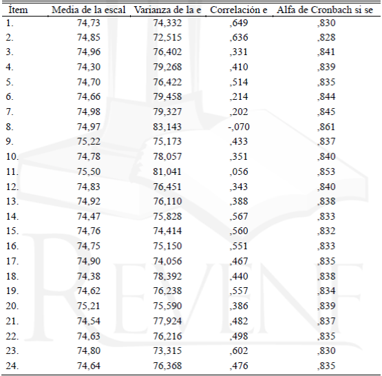 El grado de confiabilidad de la consistencia interna de la escala es adecuado, con un Alfa de Cronbach de 0,84 (84%). Solamente el ítem 8 presentó un resultado negativo en la correlación elemento-total, por tanto, si este se eliminara, el Alfa de Cronbach aumentaría un 0,016, con un total final de 0,860 (86%), lo cual demostraría un grado de confiabilidad aún mayor, aunque si no se elimina no afecta la confiabilidad de la escala.