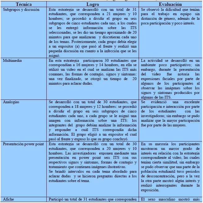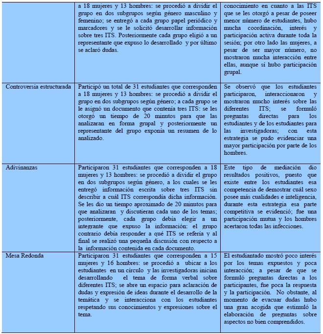 Para abordar el tema de ITS , se eligió ocho estrategias de mediación didáctica: subgrupos y discusión, multimedia “Video”, analogías, controversia estructurada, adivinanzas, afiche, power point y mesa redonda; cada estrategia se dio de forma presencial grupal, durante 40 minutos, mediante el uso de técnicas visuales, auditivas y expresión de ideas de los adolescentes, debido a las características propias de la población participante, dado que se pretende que a través de ello se pueda desarrollar un proceso de enseñanza y aprendizaje que permita la expresión de ideas para reorganizar la información que poseen junto a la nueva, lo cual da paso al análisis y reflexión en torno a fomentar el cuidado de la salud sexual y salud reproductiva de la población adolescente.