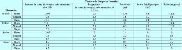 Los métodos de limpieza intestinal que disminuyeron los rangos normales de los electrolitos fueron: el fosfosoda oral, la administración de suero fisiológico por SNG y los enemas de suero fisiológico más neomicina al 0,25% con respecto a el potasio y el calcio, el sodio y cloro respectivamente.
