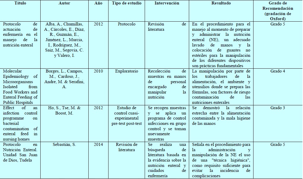 En esta misma línea, la investigación de Sebastián (2014) señala en el procedimiento para la administración y manipulación de la NE el uso de una "técnica higiénica", como requisito suficiente para evitar la incidencia de complicaciones. Se destaca que esta recomendación tiene una gradación de calidad 5, según la escala CEBM (Centro de Oxford para la Medicina basada en la evidencia - Grados de comprobación).