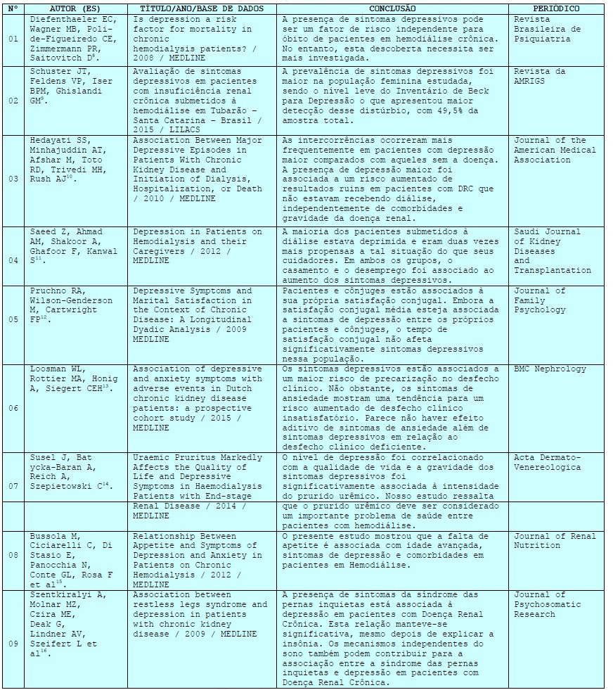 Resumo: O objetivo desse estudo é conhecer o impacto dos fatores associados à sintomatologia depressiva na saúde de idosos em hemodiálise. Trata-se de uma revisão integrativa realizada em junho de 2017 com artigos selecionados por meio da Biblioteca Virtual em Saúde. Foram utilizadas duas combinações de descritores. A primeira foi: Associação; Depressão; Idoso e Diálise Renal. Em seguida, utilizou-se a segunda combinação: Depressão; Diálise renal e Idoso, fazendo-se uso da inter-relação do operador booleano and. Os critérios de inclusão foram artigos publicados em língua portuguesa e inglesa entre 2007 e 2017, ser artigo gratuito e disponível eletronicamente, ter idosos como limite da pesquisa, ter transtorno depressivo maior e depressão como assuntos principais, além de possuir conteúdo relevante para responder o objetivo deste estudo. Após a aplicação dos critérios, selecionou-se 9 artigos, sendo que 8 (88,9%) estão indexados da MEDLINE e 1 (11,1%) na LILACS. Encontrou-se 4 fatores: anorexia, síndrome das pernas inquietas, prurido urêmico e desemprego. Os sintomas depressivos configuram-se nas comorbidades mais frequentes em pacientes em hemodiálise. Além disso, podem estar associados a maior risco de complicações dialíticas e cardiovasculares, au mento da morbimortalidade, não adesão terapêutica e redução da qualidade de vida, tornando a incidência de suicídio dez vezes maior em relação à população geral. Conclui-se que há necessidade de fortalecimento da vigilância da equipe profissional para que esteja atenta às manifestações psiquiátricas com o objetivo de realizar o diagnóstico precoce e evitar maiores impactos.