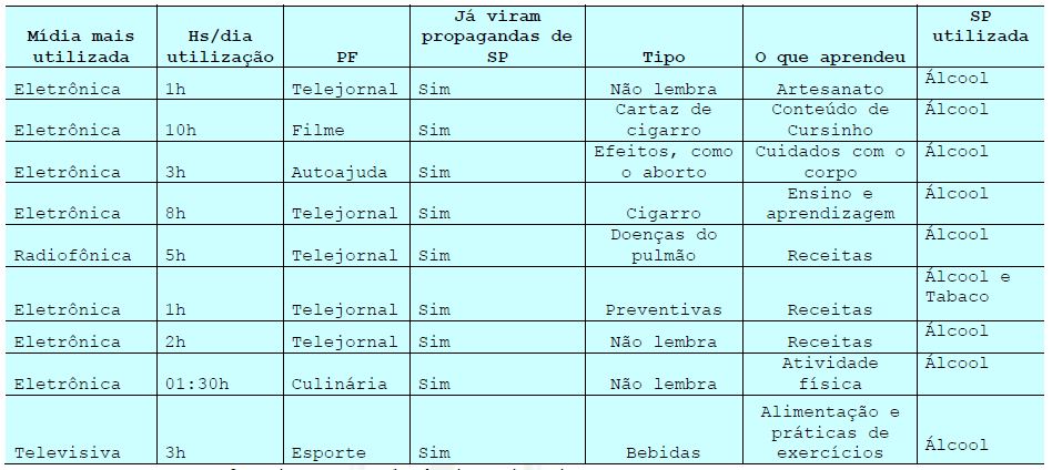 Como apresentado no quadro 2, a mídia mais utilizada pelos participantes do estudo é a eletrônica (internet), variando de usos pontuais até longo períodos durante o dia. Os programas jornalísticos se destacaram como os preferidos pelos profissionais na grade de comunicação das mídias, porém não sendo o principal meio de acesso a informações sobre substâncias psicoativas, uma vez que, outras modalidades de programas também deram acesso a tais conteúdos.