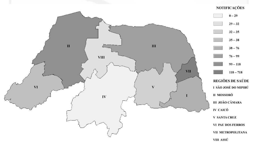 Quando analisado o quantitativo de notificações distribuídos entre as RS onde residiam os casos, visualiza-se número considerável naquelas em que as maiores cidades do RN estão localizadas, a exemplo da RS Mossoró (II) e a da RS Metropolitana (VII), conforme consta na Figura 2.