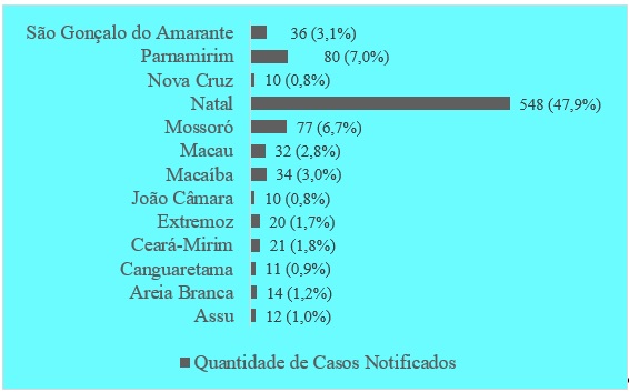 O município que apresentou maior número de notificações foi Natal com 548 notificações. As cidades com menor número de casos foram Nova Cruz, com 10, e João Câmara, com 10, pertencentes à RS Litoral Sul e Agreste (I) e à RS Mato Grande e Salineira (III), respectivamente.
