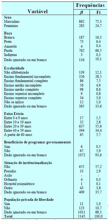 Os dados permitem compreender que maior parte dos casos confirmados 862 são do sexo masculino (75,28%), 762 de raça parda (66,5%), 326 com escolaridade a nível de ensino fundamental incompleto (28,5%) e que constituído principalmente por 637 pessoas entre 20 e 39 anos (55,63%).