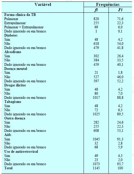 Encontrou-se uma predominância de 820 casos com apresentação clínica da forma pulmonar da TB (71,62%), 1045 desenvolveram AIDS (91,27%) e 845 que entraram no serviço na situação de caso novo (73,80%).