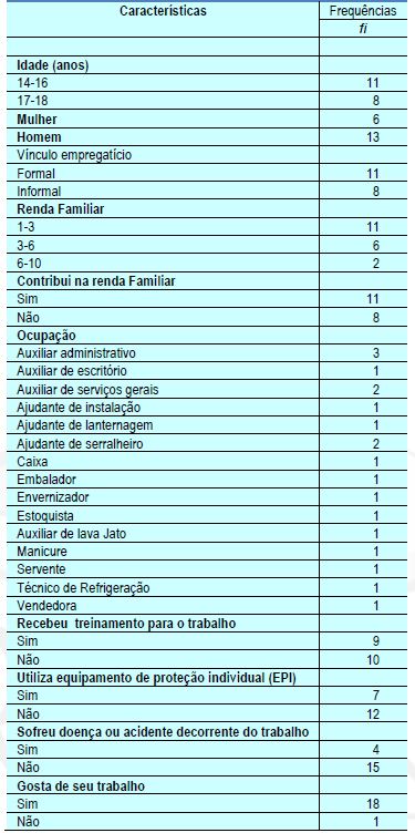 Em relação aos acidentes de trabalho e doenças decorrentes, 4 alunos dessa amostra referiram ter sofrido essas situações, problemática essa, bastante preocupante, principalmente quando se trata dessa faixa etária em que a repercussão de um AT pode modificar completamente sua trajetória social. De fato, um estudo realizado na Província de Cusco (Perú), com 375 alunos trabalhadores situados na faixa etária de 10 a 17 anos, 72% referiram já ter sofrido lesões leves (cortes e abrasões), 3% relataram ter-se envolvido em lesões graves (amputações, luxação e fraturas) 21.
