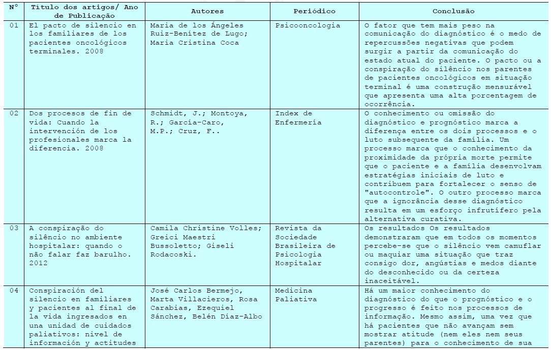 A partir da análise dos estudos emergiram duas categorias: 1) O fenômeno da conspiração do silêncio e 2) Vivências da conspiração do silêncio: suporte para o paciente, apoio à família e conhecimento dos profissionais de saúde.