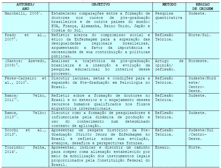 Neste ínterim, no desenvolvimento histórico da pós-graduação no Brasil verifica-se uma distribuição geográfica concentrada na região sudeste, o que impulsionou a criação de políticas fomentadas, em sua maioria, pela CAPES para favorecer a descentralização, a implementação e o crescimento de PG em outras regiões do Brasil 9. Alguns estudos 4),(8 sinalizam a preocupação com a interiorização dos PPG, uma vez que a sua maioria está concentrada na região sudeste, o que corrobora com as informações dos artigos selecionados para análise, que entre os oito artigos, três foram advindos da região sudeste exclusivamente e dois da região sudeste em parceria com outras regiões.