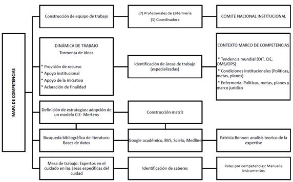 A partir de la búsqueda en fuentes de información expuestas en la metodología se logró recuperar 60 información presentada por Carrillo19, quien amplía la teoría de Benner. Por lo tanto, se procedió a elaborar un mapeo de competencias. Véase Figura 1.