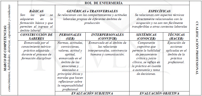 El marco de competencias empleado como matriz en el proceso de construcción abarca las competencias planteadas por Mertens, las cuales se analizan con las establecidas por el Consejo Internacional de Enfermería (C.I.E) (25 para construir un marco propio institucional.