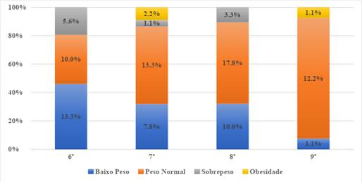 A classificação do peso da amostra segundo o ano em curso revelou associação estatisticamente significativa de forma que, entre a 6º e 9º ano, ocorre redução do número de discentes com baixo peso (de 13,3% para 1,1%) e aumento do número de alunos com peso normal (de 10% para 12,2%) (Figura 1).