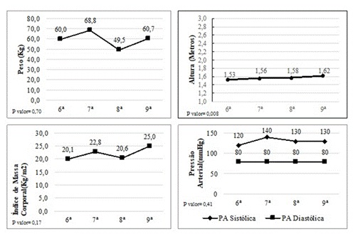Na Figura 2, apresentam-se os resultados da comparação dos valores médios para as variáveis antropométricas e pressão arterial segundo o ano em curso. Verifica-se, que não houve diferença estatisticamente significativa no Peso, IMC e PAS ao