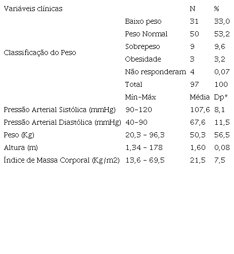 Em relação à caracterização clínica, observa-se predomínio de alunos que apresentam peso normal (53,2%) com peso médio de 50,3 kg. Entretanto, 45,8% apresentaram peso fora da normalidade seja para mais ou para menos. A pressão arterial média foi de 107/67mmHg em média, altura média foi de 1,60cm e IMC de 21,5 Kg/m2, em média (tabela 2).