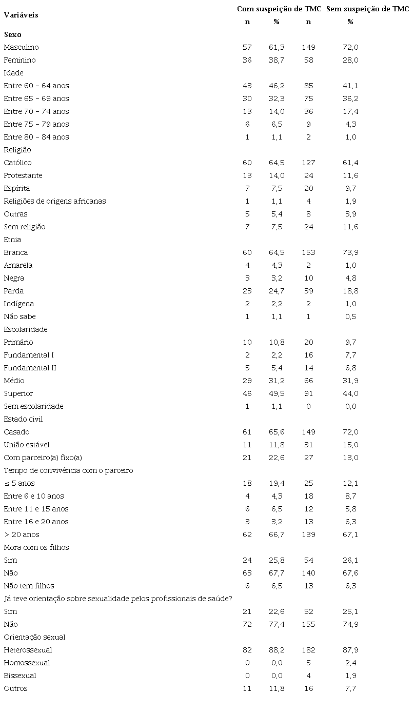 Predominou-se no presente estudo os idosos do sexo masculino (n=206; 68,7%), com idade entre 60 e 64 anos (n=128; 42,7%), autodeclarados brancos (n=213; 71,0%), com ensino superior (n=137; 45,7%) e que nunca receberam orientações sobre sexualidade pelos profissionais de saúde (n=227; 75,7%). Além do mais, evidenciou-se prevalência geral de TMC de 31% (n=93) e os idosos do sexo masculino foram os mais acometidos, conforme Tabela 1.