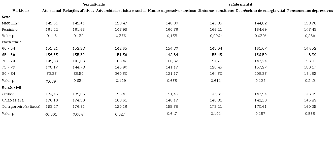 Conforme Tabela 2, o teste de Mann-Whitney demonstrou associação significativa entre o sexo feminino e, os sintomas somáticos e decréscimo de energia vital. Já o teste de Kruskal-Wallis demonstrou que os idosos com idade entre 65 e 69 anos melhor vivenciam o ato sexual. Além disso, aqueles com parceria fixa melhor vivenciam o ato sexual, melhor vivenciam as relações afetivas e possuem menores adversidades física e social relacionadas as suas vivências em sexualidade (Tabela 2).