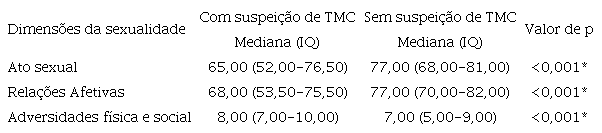 Observa-se na Tabela 3 que, os idosos com suspeição de TMC tiveram as menores medianas nas dimensões ato sexual e relações afetivas, indicando que esse grupo pior vivencia essas duas dimensões de sua sexualidade quando comparado com os idosos sem suspeição. Não obstante, observou-se que os participantes com suspeição de TMC tiveram maior mediana na dimensão adversidades física e social evidenciando que possuem pior enfrentamento face a tais adversidades (Tabela 3).