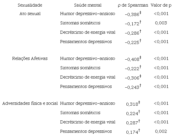 A Tabela 4 demonstra que, todas as dimensões da sexualidade estão significativamente correlacionadas a todos os domínios do SRQ-20. Todavia, as correlações foram fracas e moderadas e, a maior correlação identificada foi negativa entre as relações afetivas e os sentimentos relacionados ao humor depressivo-ansioso (Tabela 4).