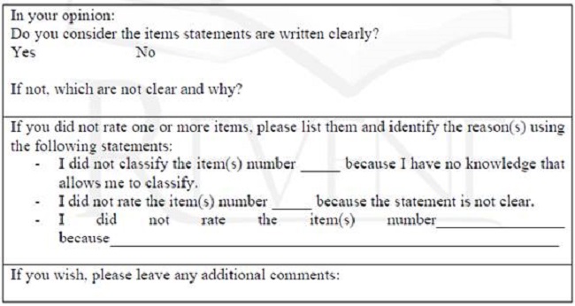 Stage V - Test of the prefinal versions: the prefinal version of the Portuguese translation of each instrument was tested in a sample of nursing educators/faculties. Each participant completes the instruments and a brief questionnaire (presented in Figure 1) regarding the comprehensibility of each item.