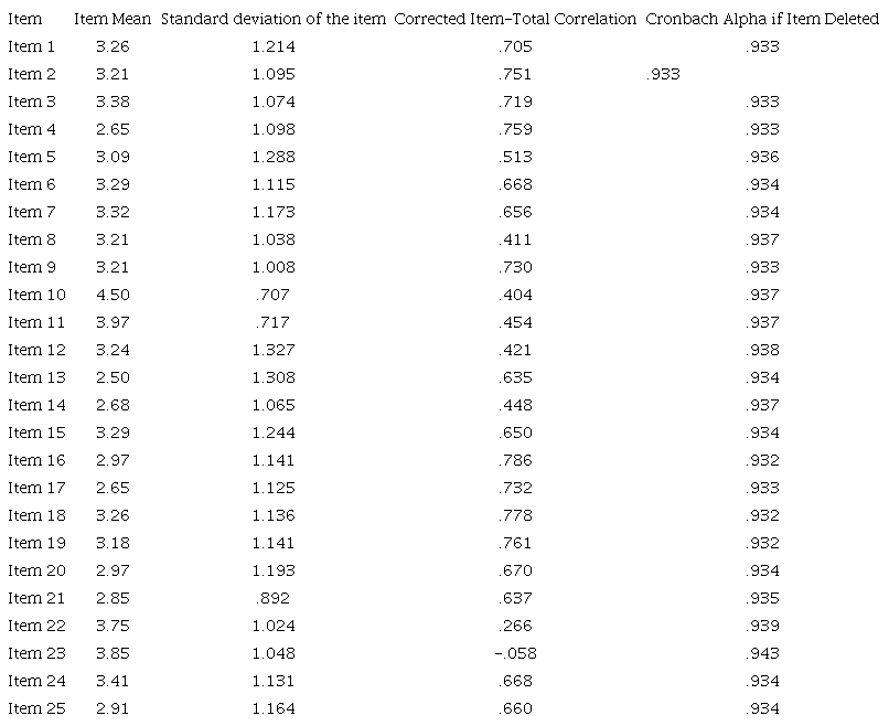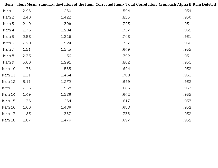 The item means of the EBPI-E range between 1.38 (item 15) and 3.11 (item 12). The EBPI-E presents an alpha Cronbach of 0.95 and the corrected item-total correlations ranged between 0.59 and 0.84, representing a moderate to a strong correlation between the items and total score (Table 3).