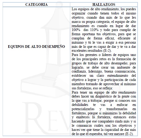 Del mismo modo, se obtuvo una categoría no prevista en los factores que intervinieron en el estudio: la categoría de equipos de trabajo de alto desempeño, lo cual refleja que las supervisoras de enfermería no solo aplican los conocimientos esenciales de gestión, sino que consideran oportunidades mediante la formación de dichos equipos; por lo cual, innovan en la gestoría del talento humano y, a su vez, tal nueva categoría es un hallazgo sobresaliente de la investigación.