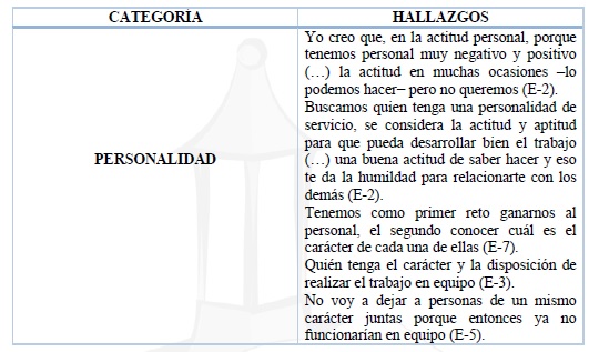 Las características que implican la personalidad son un factor importante para la gestión del talento humano. Para Belbin14, la personalidad es esencial en la integración de equipos, debido a que forma parte de los roles de equipo y es el principal tema de su teoría. En uno de sus hallazgos, refiere que, dentro de los equipos con integrantes de personalidades similares, no se obtienen efectos favorables respecto a la consecución de los objetivos del equipo.