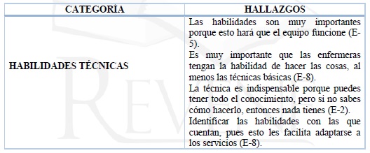 Son aquellas que se refieren a la capacidad que tienen las personas para aplicar métodos, procedimientos y técnicas de un área del conocimiento específica y que pueden ser especializadas17. En los equipos de trabajo, se usan las habilidades técnicas de sus integrantes para alcanzar los objetivos del equipo; de ahí, la importancia de identificarlas y desarrollarlas. Además, estas habilidades implican talento para realizar determinadas tareas; sin embargo, no significa que se tenga aptitud para realizar otro tipo de funciones, por tanto, el desarrollo de la habilidad es una parte de competencia para cumplir con una meta específica18. Las supervisoras implementan estrategias, para que las habilidades técnicas del personal de Enfermería sean empleadas de manera óptima en la conformación de los equipos de trabajo.