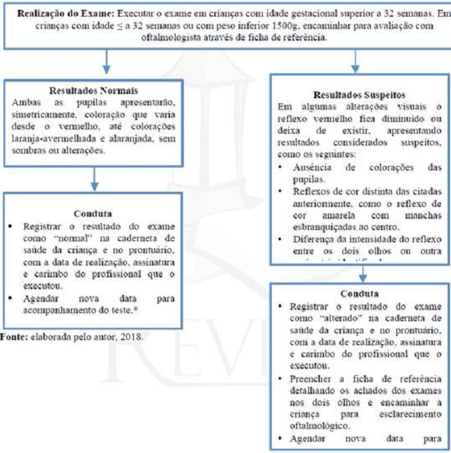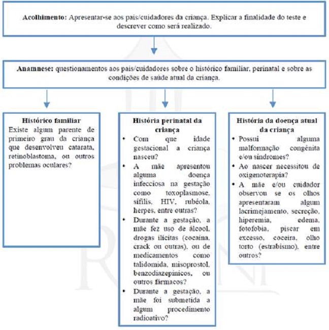 Embora seja considerado um exame de caráter simples, sua execução merece cautela, uma vez que o profissional necesita verificar atenciosamente as características do reflexo. Sendo fundamental que o examinador conheça a anatomia ocular, acrescente em sua avaliação uma anamnese detalhada sobre características referentes ao nascimento, à história familiar, perinatal e neonatal, os quais podem manter uma estreita relação com as possíveis alterações encontradas14.