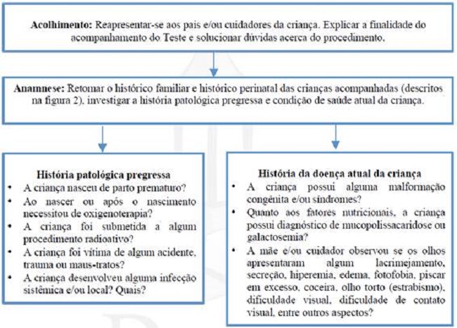 Etapas do TRV: sintetizadas através de fluxogramas, elaborados e divididos de acordo com as etapas para realização do exame, abordando os itens: acolhimento, anamnese (coleta de informações importantes que poderão nortear possíveis achados, como: história familiar, perinatal e da doença atual da criança), realização do exame/avaliação (mostradas as etapas sequenciais da realização do TRV pelo enfermeiro nas crianças que são acompanhadas nas consultas de C e D, tendo por base as evidências científicas identificadas na revisão integrativa), conduta e orientações (direcionamento adequado, mediante os possíveis resultados), descritas logo após nas Figuras 2, 3 e 4. Sugere-se que o exame seja realizado nas seguintes faixas etárias: 6 meses, 1 ano, 1 ano e 6 meses, 2 anos, 2 anos e 6 meses, 3 anos, 4 anos, 4 anos 11 meses e 29 dias.