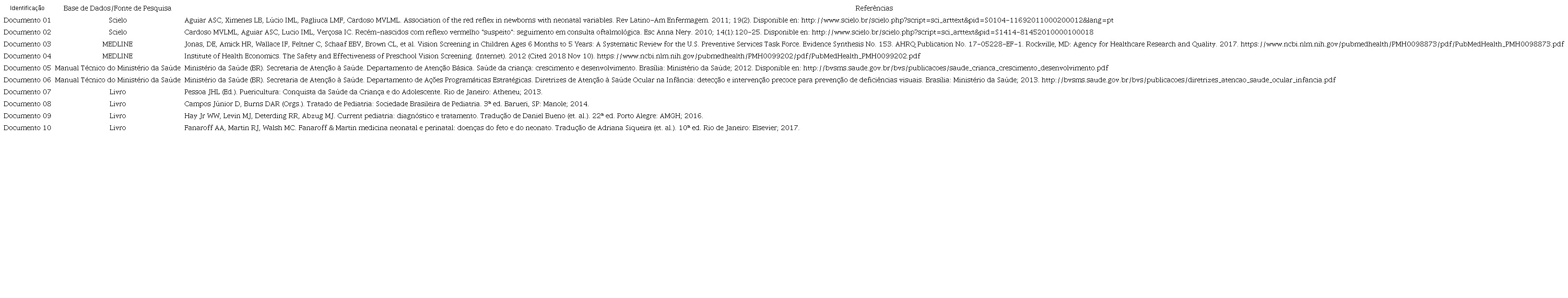 Aguiar ASC, Cardoso MVLML, Lúcio IML. Teste do Reflexo Vermelho: forma de prevenção à cegueira na infância. Rev Bras Enferm. 2007; 60(5): 541-5. http://www.scielo.br/scielo.php?script=sci_arttext&pid=S0034-71672007000500011