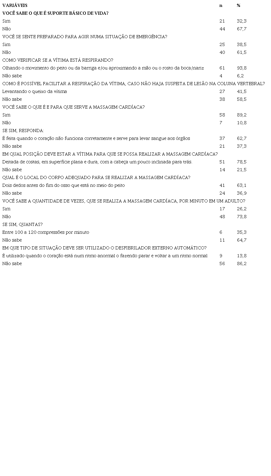 Os resultados desse estudo mostraram que o conhecimento do leigo sobre SBV é insatisfatório, materializado no fato de 67,7% dos entrevistados não saberem o que é SBV e 61,5% não se sentirem preparados para agir em uma situação de emergência. Estudos16-19realizados em vários países como Brasil, Japão, Singapura e Portugal atribuem tal desconhecimento à falta de treinamentos da população a respeito da temática.