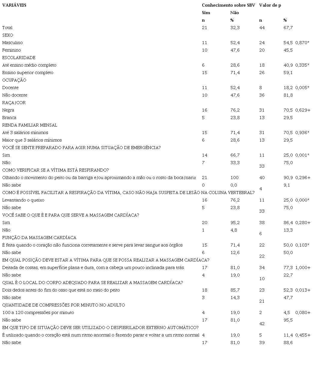 Constatou-se a associação do conhecimento de SBV com ser docente, sentir-se preparado para atuar em situação de emergência, saber como facilitar a respiração da vítima, caso não haja suspeita de lesão na coluna vertebral e saber o local do corpo adequado para se realizar a massagem cardíaca, o que ratifica a importância da capacitação da população leiga acerca da temática.
