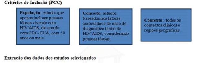 No que respeita aos conceitos, pretende-se a inclusão de estudos baseados nos fatores associados e de risco do diagnóstico tardio de HIV/AIDS, considerando pessoas idosas. Assim, compreende-se na epidemiologia fatores associados, como a causalidade suficiente de um conjunto de condições mínimas, que inevitavelmente acarretam a ocorrência de uma doença e como fator de risco, qualquer evento que tenha a probabilidade de ocorrência desfavorável de uma doença ou agravo à saúde15. Quanto ao elemento contexto, serão integrados todos os contextos clínicos e regiões geográficas.