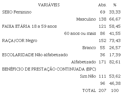 No que se refere à caracterização sociodemográfica da população, o público foi composto predominantemente por pessoas do sexo masculino (66,67%), com faixa etária de 18 a 59 anos (58,45%), pertencentes à raça/cor negra (73,43%), e alfabetizados (82,61%).