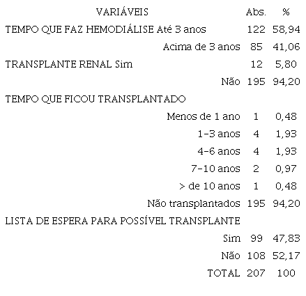 Ainda acerca das características clínicas, pode-se constatar a partir da Tabela 3 que a maior parte dos pacientes, 122 (58,94%), estava em tratamento hemodialítico há menos de 3 anos, enquanto 85 (41,06%) realizavam tratamento a tempo superior há 3 anos. Dos 207 que responderaram ao questionário, apenas 12 (5,80%) já realizaram transplante renal. Destes 12 transplantados, apenas 1 paciente (0,48%) ficou sem necessidade da hemodiálise por mais de 10 anos, os demais retornaram para as sessões em um tempo inferior, em virtude da falência ou rejeição do órgão transplantado.