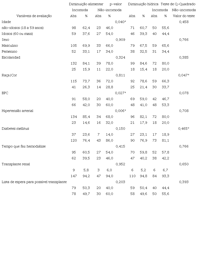 A tabela 3 apresenta os fatores associados à percepção de incômodo com a restrição alimentar e hídrica enfrentada pelos pacientes. Com relação à percepção de incômodo com a diminuição de líquidos, verificou-se associação com estar em idade produtiva (p = 0,040), receber o benefício de prestação continuada (p = 0,027) e ser hipertenso (p = 0,006). Quanto à percepção de incômodo com a restrição alimentar, constatou-se associação com ser da raça/cor negra (p = 0,047).