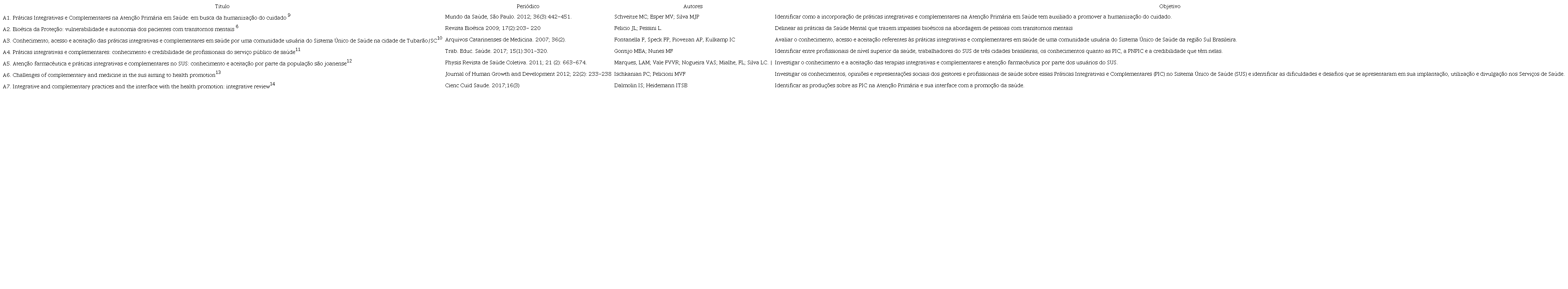 Na aproximação com a temática, procurou-se obras publicadas sobre a autonomia do usuário na implementação de PIC e identificou-se que os estudos relacionados ao tema são escassos. Após a leitura e análise do conteúdo dos artigos selecionados obteve-se dados relevantes que serão expostos a seguir. Para a sistematização dos dados, elaborou-se um quadro resumo no qual constam as variáveis estudadas: título do artigo, periódico, autores e objetivos.